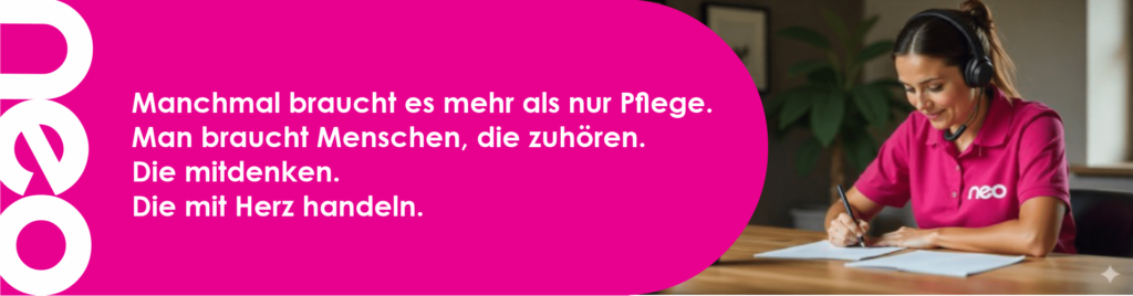 neo Pflege steht für neue, innovative Pflegekonzepte, kreative Lösungen und kurze Wege. Wir nutzen moderne Technik dort, wo sie entlastet – und setzen auf echte Nähe dort, wo sie gebraucht wird. Keine Pflege „nach Schema F“, sondern individuell, flexibel und menschlich.
